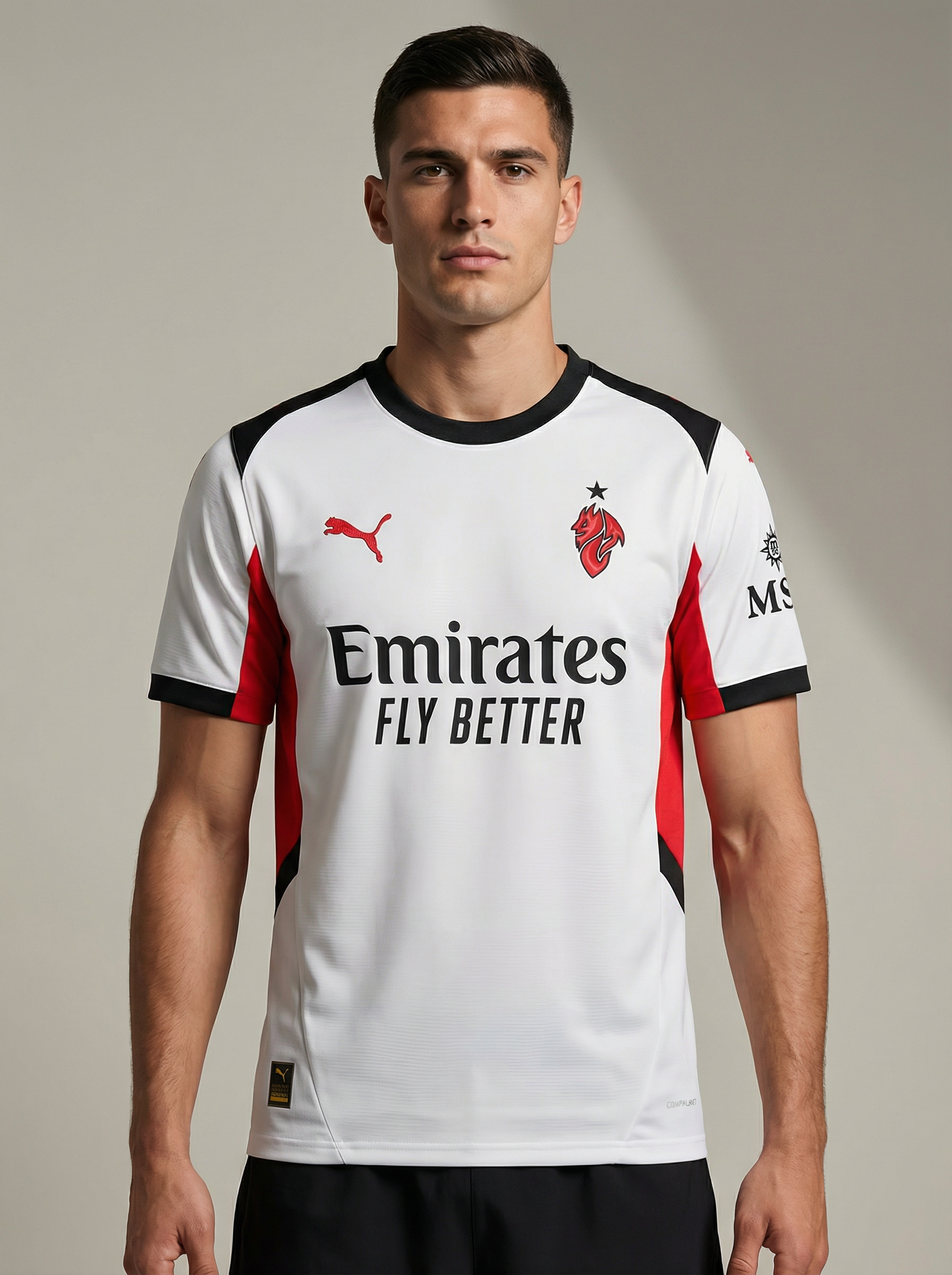 Show your unwavering support for the Rossoneri with the official AC Milan 2023-24 away replica jersey! This eye-catching white kit, accented with vibrant red panels on the shoulders and classic black trim, is a modern take on the club’s heritage and is perfect for fans who want to wear the same style as the players on match day.